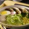 Em uma tigela, sirva o caldo de legumes, os noodles, o ovo, as cebolinhas, o milho amarelo, o naruto, o gergelim preto, o rábano, um pouco dos cogumelos do caldo e a alga para decorar, aproveite.